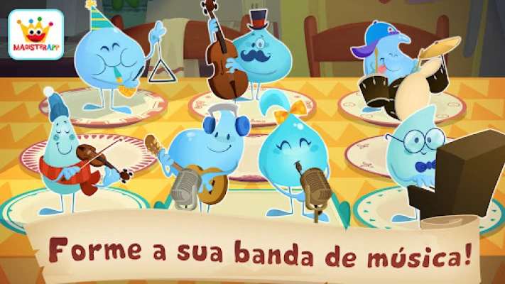 Gotinhas: jogos para bebe 2 5 convida os pequenos a transformar barulhos em uma sinfonia encantada. Baseado no conto "O baile das gotinhas" de Danilo Giovanelli, este app permite criar melodias com louças e explorar um quarto musical mágico. Sete gotinhas com vozes únicas esperam crianças de 2 a 6 anos para brincar e descobrir o mundo da música, sem anúncios.